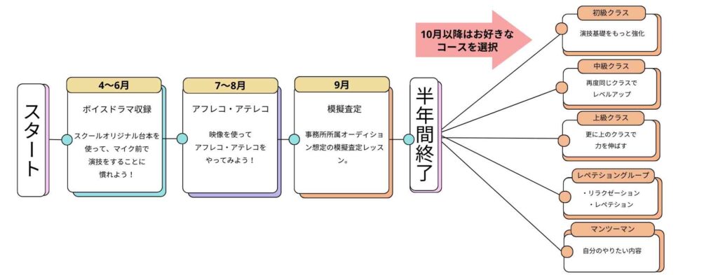 | 初級クラス | 日曜 10:00〜12:00 | 基礎をまるごと網羅した欲張りパック。 滑舌、レペテション、自己PR、模擬査定、アクション、舞台発表まで。初心者からでも声優・俳優の「第一歩」をこのクラス一つでまるっと学べます。 |